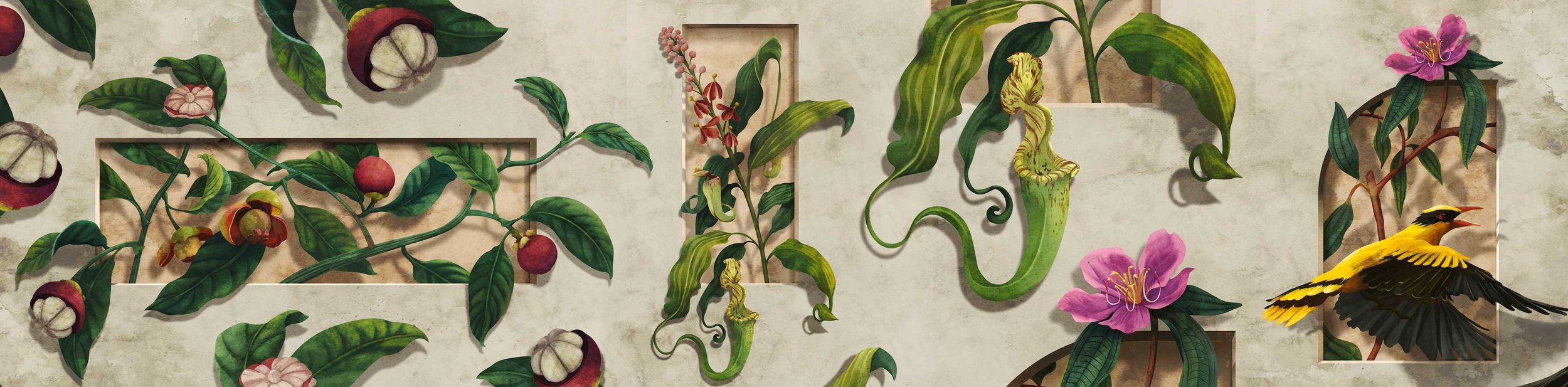 To light up the room at night, each of the 4 visual openings functioned as a lightbox with outer botanical elements attached as a separate layer to add dimension. The lightboxes were placed at gaps between the buffet tables. Connecting these lightboxes were wallpaper designed to enhance the colonial inspired furnishings and create an illusion of natural elements creeping along the walls of the suite.