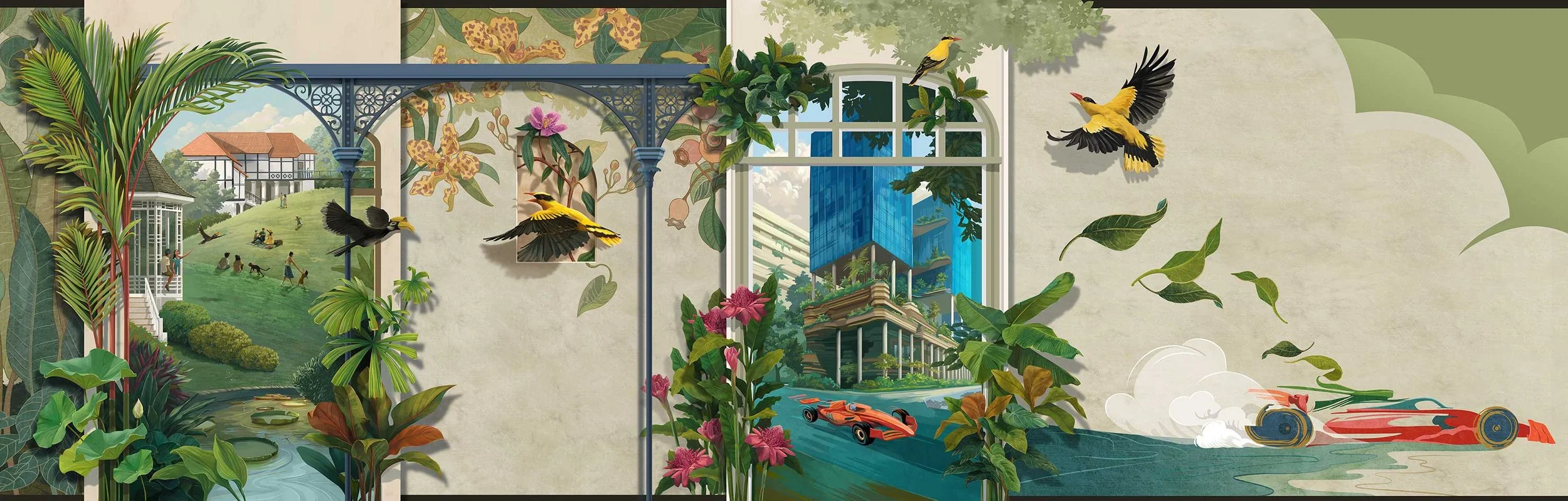For the 2023 Singapore Grand Prix, the Tourism Board wanted to adorn the walls of their VIP suites with artworks that celebrated Singapore as a city in nature. In addition, the board requested that the theme for the interior design of the suite be an homage to local heritage whilst being forward looking.